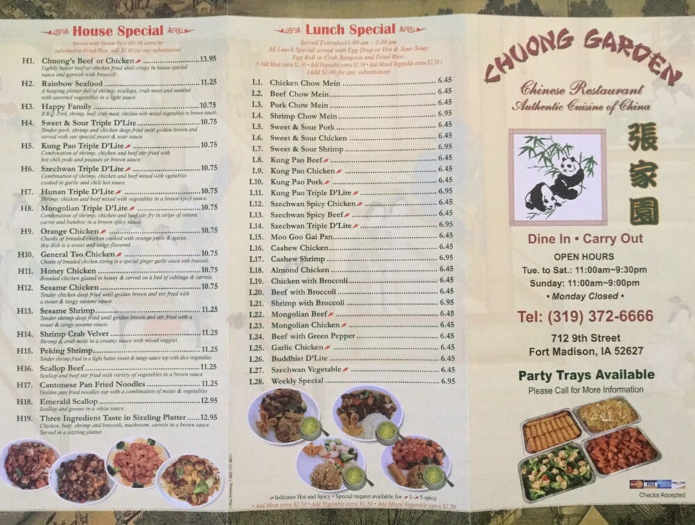 Welcome to Chuong Garden, a delightful gem nestled in the heart of Fort Madison, IA. This unclaimed Chinese restaurant offers a welcoming ambiance perfect for families and groups alike. Known for its efficient service and cozy vibe, it serves a variety of lunch specials that stand out, such as the Broccoli and Beef and Mongolian Beef. Customers praise the dishes for being freshly wok’d and generously portioned, making it a value-for-money experience.